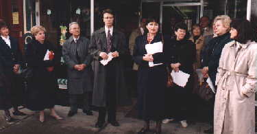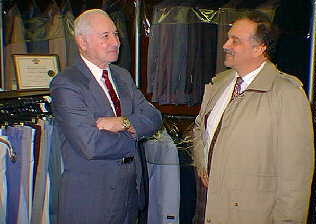 Pictured above are Richard Eads of the Tioga County Department of Economic Development and Planning and Marte Sauerbrey of the Tioga County Revitalization Task Force surrounded by local officials (Photo by Joe Langevin). Pictured below are Bill Lawrence, owner of Bandler, Stiles, and Keyes in Owego, and Bill Caloroso of the Tioga County Legislature, discussing the elimination of sales tax on apparel.