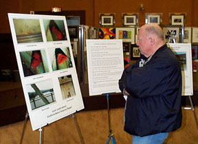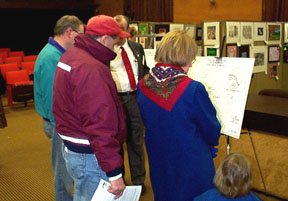 Pictured above, a concerned citizen reviews one of the bypass plans. Pictured below, former Village of Owego mayor Richard Hoban studies photos of the deteriorating condition of the Court Street Bridge.