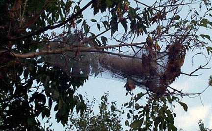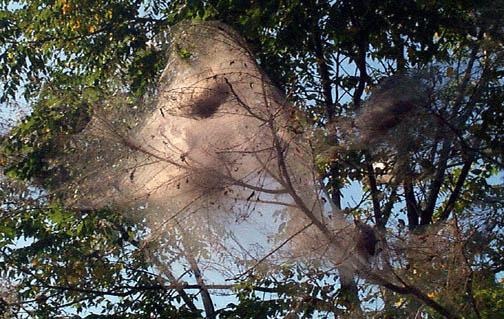 A telephone conversation with Brian Caldwell at the Cooperative Extension Office of Cornell University was educational and set my mind at ease that our hills will not become barren. He identified the webs as belonging to the Fall Webworm, the scientific name is Hyphantria cunea. The fall webworms are seldom numerous enough to cause total defoliation, and hopefully next year won't get any worse than this year. They appear in late summer and the nests don't do much damage to the trees because the leaves have already completed most of their function for the tree.