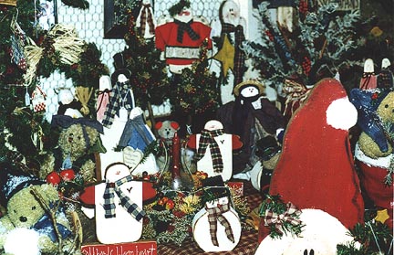 famous for their country, traditional, and Victorian bears. Santas of all kinds, made of cloth, wood, ceramic and pecan resin. There will be snowmen, wood, cloth, resin and clay. Birdhouses, functional wood items, tole painting on different mediums, fine ceramics, porcelain, fimo and salt dough art, potpourri, floral arrangements of all kinds, a gourment bakerys, country and Victorian dolls, jewelry, gift baskets, vests and sweat shirts, tree skirts, primitive wood, fall decorations, fine wooden clocks and game boards country shelves, Christmas ornaments, Halloween items, handmade bees wax candles, bees wax ornaments, Noah's Arks, lots of gingerbread men, herbal soaps and much more.