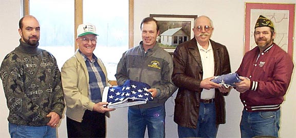 Clyde Tims of the Susquehanna Republican Committeeman presents Joe Tims, chairman of the Apolacon Township Board of Supervisors, with a US flag from Congressman Don Sherwood of the 10th District of Pennsylvania. The flag will be used at the Township Municipal Building. The old flag was given by Don Kannenburg, supervisor, to Burt Baldwin, past Commander VFW Post 6824, to be disposed of properly. Pictured above (left to right) are Rick York, supervisor; Clyde Tims, Republican Committeeman; Joe Tims, board of supervisor chairman; Don Kannenberg, supervisor; Burt Baldwin, past post commander VFW6824.