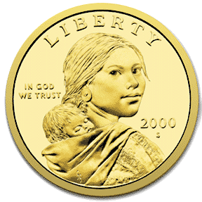 The new dollar coin will be gold in color and will be the same size as the Susan B. Anthony coin. Its obverse (heads), designed by Glenna Goodacre, depicts Sacagawea, the 15-year-old Shoshone woman who accompanied Lewis and Clark on their expedition to the Pacific Ocean in 1804-1806. She is pictured carrying her infant son, Jean Baptiste, whom she carried and cared for on the 3,000-mile journey. Goodacre used a 22-year-old Shoshone college student as her model for the coin's design. The reverse (tails), designed by Thomas D. Rogers, Sr., depicts a soaring American bald eagle and 17 stars - symbolizing the 17 states of the union at the time of the Lewis and Clark expedition. Sacagawea was responsible, in large part, for the success of the expedition through her navigational, diplomatic, and translating skills. She was accorded full voting rights by Lewis and Clark as a member of their expedition. Coins for general circulation will be minted at the Philadelphia and Denver Mint facilities. The Susan B. Anthony Dollar Coin is being minted for the first time in years and the last time ever in 1999. The coin's obverse features a profile of Susan B. Anthony, the pioneer of this country's Woman's Suffrage Movement. On the reverse is a symbolic representation of the Apollo 11 Spacecraft ("The Eagle") in commemoration of the historic moon landing on July 20, 1969. Dollar coins issued in this century are the Susan B. Anthony Dollar (1979-1981 and 1999), the Eisenhower Dollar (1971-1978), the Peace Dollar (1921-1935), and the Morgan Dollar (1878-1921). |