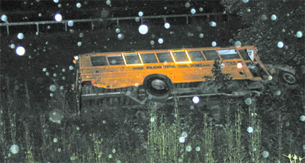 | A stolen Owego-Apalachin school bus is abandoned on its side in the rain near Exit 66 on Route 17 in Apalachin. Two teenagers stole the 60-passenger bus around 2:30 am on July 27. They took it for a joy ride and lost control of the vehicle, causing it to roll down an embankment. See story. |