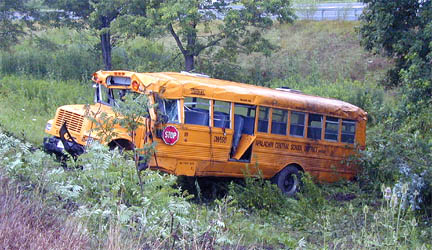 The two boys broke a window of a door to the garage, entered the building, and caused more damage. Bus #193 was in the garage for repairs and had its key in the ignition. The teenagers started the 60-passenger bus, crashed it through the garage door, and drove away. While headed east on Route 17, the driver lost control of the bus near exit 66 in Apalachin. The bus rolled down an embankment and landed on its side facing west. The boys got out of the bus and headed back to Exit 66 on foot. They were stopped and questioned by New York State Police around 3:15 am and were transported to the Public Safety Building on Route 38 in Owego. The boys were then taken by ambulance to Wilson Memorial Regional Medical Center in Johnson City for treatment. According to Owego-Apalachin School District officials, the damages are about $100,000. |