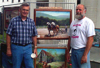 | EN PLEIN AIR - Bob Merwin (left), one of the artists participating in Owego's En Plein Air Art Show, discusses his paintings with Craig Maury (right) of Waverly. During the annual event, artists display their works on the porches of Owego's beautiful homes. |