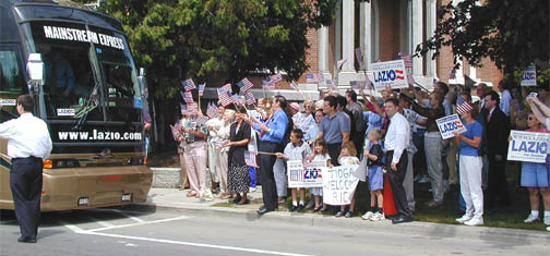 | A large crowd gathers at the Courthouse Square to greet Rick Lazio, Republican candidate for the U. S. Senate. | Rick Lazio is the Republican candidate for Senator. |