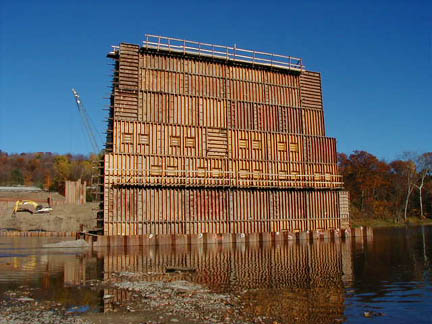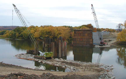 | October 22, 2000 - (below) This photo shows three of the stages of building a concrete pier for the bridge. The coffer dam in the foreground is near completion - the piles have been driven down into the riverbed, but the water has not yet been pumped out of the dam. Once that is done, a large wooden form for concrete will be built - just like the one in the coffer dam in the middle of the river. This wooden form will eventually be removed to reveal a concrete pier - just like the one in the background of the photo, behind the second pier's wooden form. |
