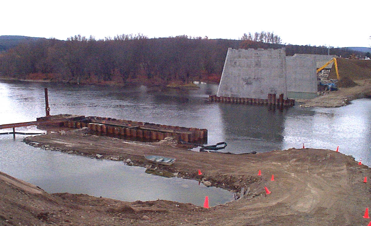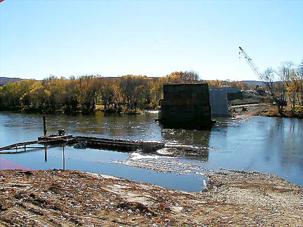 October 15, 2000 - (below) Construction site of the new bridge in Campville, looking toward Apalachin. In the foreground, a coffer dam is being built where a pier is to be located. A coffer dam is a watertight, temporary barrier which encloses the construction site of a pier. The water inside the coffer dam is pumped out, creating a dry construction area. |