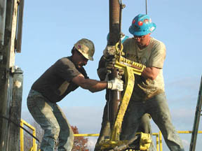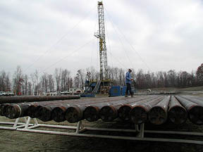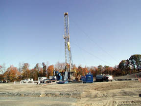 Key Energy Drilling Company out of Michigan is drilling a 21" hole that will house a 16" steel pipe cemented in to protect the surrounding water table. The final well will be approximately 4,500 feet deep. At that, level horizontal shafts will later be drilled to provide access to the gas retaining formation. |
