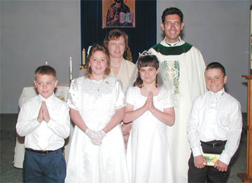 | RIGHT - Four children from St. Francis Savier and St. Patrick Churches in Friendsville and Middletown received their First Communion on May 6. First row: Matt Bores, Samantha Bores, Bridgette Conboy, and Jacob Balchikonis. Second row: Ellen Bieleski, teacher, and Father Jeff Paulish, Pastor. | ![]() |