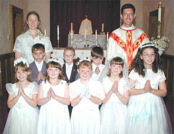 | RIGHT - Eight children from St. Thomas the Apostle Church in Little Meadows received their First Communion on Sunday, May 6. First Row: Marina Fargnoli, Erin Scott, Emily Hewes, Katie Bowen, Ashley Adams. Second row: Vincent Fizzano, Joshua Popek, and Tyler Murphy. Third row: Ann Copeland, teacher, and Father Jeff Paulish, Pastor. | ![]() |