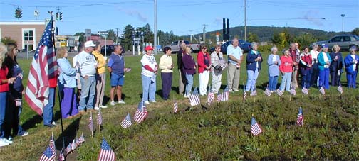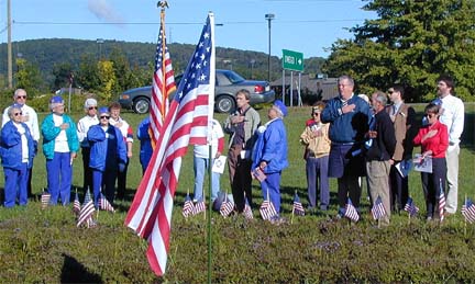 In the wake of the September 11, 2001 attack on the World Trade Center and the Pentagon, the Owego Kiwanis Club, the Ladies Auxiliary of the VFW, and area residents show their unity by displaying flags at the Kiwanis garden area across the street from the intersection of Route 17C and Hickories Park Road. ![]() |