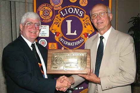 The Apalachin Lions Club has named Gabe DeSantis their Lion of the Year for 2003-2004. The award was presented to DeSantis at the Lions Installation Dinner held June 25 at the Owego Treadway Inn. Lion DeSantis, who joined the club in 1988, was recognized for his outstanding effort in collecting, sorting, and delivering between three and four tons of food for the club's annual Christmas basket program, and for his efforts as chairman of a successful pancake breakfast. Two other Apalachin Lions Club members also received honors. Lion Dave Rupright received the District 20-E2 Past District Governors Memorial Award. Lion John Sobotka was made a Melvin Jones International Fellow.