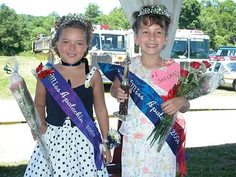 The Little Miss Apalachin Contest, which is held every year in conjunction with the Apalachin Firemen's Field Days, is open to eight- and nine-years-old girls who live within the Apalachin Fire District. The contestants are judged on communication skills, appearance, and personality. This year's judges were Joy Ivancie, Little Miss Apalachin 1993; Cheryl Ivancie, former runner-up Little Miss Apalachin; and Tony Quaranta, Apalachin Fire Chief. Jan Warner was overseer of the event. Master of Ceremonies was Jay Manarky of Owego. Pictured above are Aubrey Burke, Little Miss Apalachin 2003, and Shelby Klemmt, Little Miss Apalachin 2004.