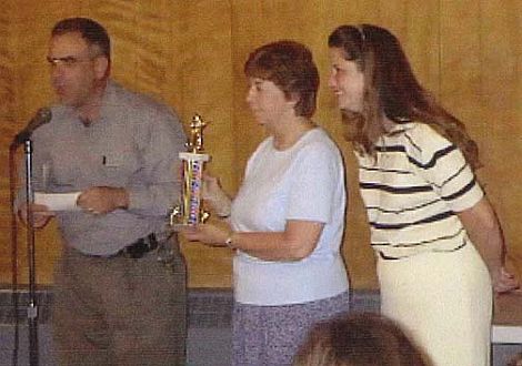 teachers Lorri Eash and Rawn Kerr a trophy and a check for $100 for the