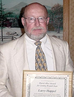 Happel was honored by the Planning Federation for his exemplary service on the Town of Owego Zoning Board of Appeals from May 1981 until April 2004, and as Chair of the board from June 1993 until April 2004. Happel was recognized for his fair treatment of both applicants