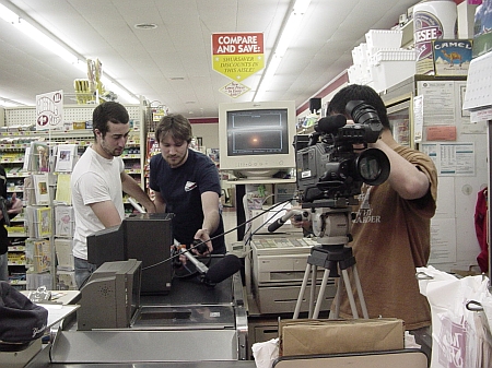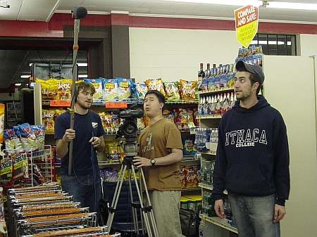 Two different people tried to rob the store at the same time only to find out in the end that the cashier was also robbing the store. The cashier was actually another robber who arrived at the store earlier and tied up the clerk. It was all part of an Ithaca College Intermediate Field Production class. The students, all Television-Radio majors with a video production concentration, were videotaping a script entitled The Hold Up written by students Peter Berg, Andrew Chu and Eric Zapakin. The script is based on a short story by Riyadh Miller. John and Bev Hitchings, owners of John's Fine Foods, graciously allowed the use of their store after hours for the shoot. The students worked with the Owego Village Police Department to make sure there were no misunderstandings about the night's events. Bucky of John's Fine Foods stayed with the students to keep the store open and help out where needed. Actors were Ryan Regan, Tim Foote, and Matt Murply. Owego Free