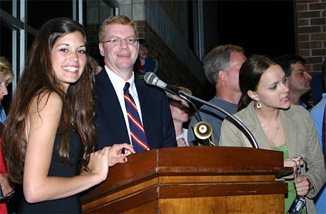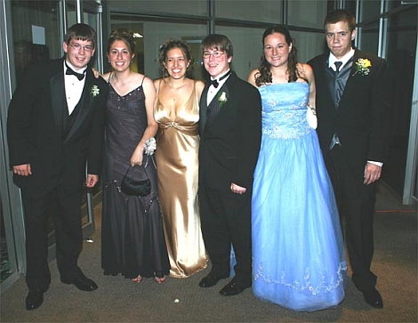 OFA Class of 2005 Senior Prom Owego Free Academy's Class of 2005 held their Senior Prom on Friday, June 3, at the Owego Treadway Inn and Conference Center in Owego. Hundreds of people stood outside in the rain, cheering the students as they arrived at the prom. The students arrived in a variety of vehicles - everything from stretch limos to RVs to motorcycles. Pictured in photos below: 1) Amber Brown, Class of 2006, and Chris Evans, a teacher at OFA, announce the students as they arrive at the prom. 2) Pam Morgan and Jared Foran arrive by stretch limo 3) Danielle Paufve and her escort arrive via motorcycle 4) Ben Kuhlman, Kerri Lavendar, Lindsay Rapp, Jon King, Amanda Brown, and Adam Thomson pose in the lobby.