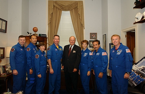 WASHINGTON, D.C. - The crew of the recent Space Shuttle Discovery mission, including its Commander, Col. Eileen Collins, met with House Science Committee Chairman Sherwood Boehlert (R-New Hartford) in his Capitol Hill office on September 20, 2005. Boehlert pointed out that two of the seven Discovery astronauts are New Yorkers: Commander Eileen Collins is from Elmira, and Mission Specialist Dr. Charles Camarda is from Brooklyn. The astronauts discussed with Boehlert their recent mission, STS-114, which blasted off from Kennedy Space Center in Cape Canaveral, Florida on July 26 and flew to the International Space Station before returning to Earth and landing at Edwards Air Force Base in California on August 9. They also discussed the President's Space Exploration Vision, which calls for returning humans to the Moon by 2020 and preparing for eventual manned missions to Mars and beyond. In July, the Science Committee unanimously passed a NASA authorization bill, sponsored by Boehlert that would enact into law the President's Exploration Vision. The legislation later passed the full House of Representatives by a vote of 383-15. Citing the 383-15 vote for his NASA Authorization bill, Boehlert said, "When I met with the crew of STS-114 today, I reminded them that just two months ago, Congress, gave them an overwhelming, bipartisan vote of confidence. But I also pointed out that the vote signified Congress' endorsement of maintaining NASA's status as a multi-mission agency. Indeed more than half of NASA's budget is spent on important programs in aeronautics, space science and Earth science that provide vital information to us about the most important planet in our solar system, the one we live on." Boehlert added, "Col. Collins and her crew performed their mission with exemplary skill and carried out their mission duties with flawless precision. Because of the fine work they conducted flying in the heavens, we now know more about the Shuttle than we ever have before, which will help NASA's talented team of engineers and technicians further improve the safety of future Shuttle flights. "It also should not go unnoticed that two of the seven astronauts