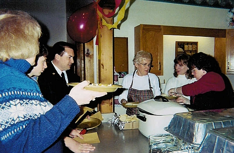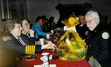 "We haven't had anyone do something special like this since the 80s," said one choked up fireman, with tears flowing down his cheeks. Around 50 firefighters from the Apalachin Fire Department and their families ventured out on the snowy evening, Saturday, January 14 to attend the event honoring them and the service they provide to the community. They were ushered into a room filled with red balloons, gold streamers, Dalmatian dog knick-knacks and toy fire trucks. The red and gold theme played out in the table coverings, table settings, and cake. Assistant Fire Chief Jarvis Henderson and Martie Frye won the two door prizes of baskets filled with goodies. Three-hundred fifty dollars was collected in a homemade fire hydrant and donated to the fire company. Pastor Pete Darling and Fire Chief Tony Quaranta made brief comments. Ed Thoman and a committee of church members planned the event,