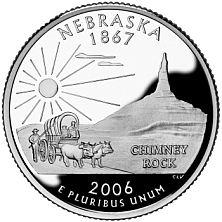 Chimney Rock is a natural clay and sandstone formation that was a landmark during the westward migration of the 1800s. The Nebraska State Quarter Design Committee received almost 6,500 designs from the state's citizens. Nebraskans voted online for their favorite of 25 designs. From those 25, the committee selected four concepts: The State Capitol, The Sower & Home of Arbor Day, Chief Standing Bear, and Chimney Rock & a Covered Wagon. "I chose Chimney Rock because I felt it best represented our state's pioneering spirit and cultural heritage," said Nebraska Governor Dave Heineman. "It reflected the resolve, persistence and incomparable work ethic that our forebears brought to the plains." Chimney Rock was designated a National Historic Site in 1956.