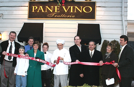 A ribbon cutting ceremony was held last month to celebrate the opening of Pane Vino Trattoria, a new restaurant on Route 17C in Owego. Pane Vino Trattoria specializes in homemade authentic Italian pasta, chicken, steak and veal dishes. The chef, Claudio Roma, offers daily specials and complimentary homemade fresh bread with every meal. The restaurant is owned by Anthony Paniccia