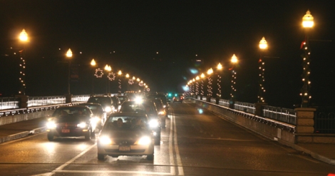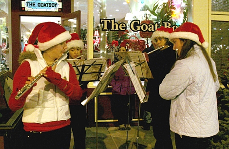 The second annual "Lights On The River" Festival in downtown Owego will be held on Friday, December 5. Pictured from last year's festival: above is the spectacular lighting display on the Court St. Bridge, below are musicians from the Owego Middle school at the Goat Boy on Front St.