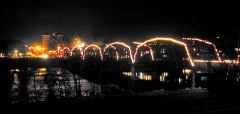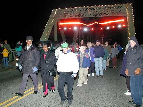 December 2001 - Hundreds of area residents came out to bid their final farewell to Owego's Court Street Bridge at a ceremony held during "Light Your Way to Christmas" on December 7, 2001. A parade (above) of officials, residents, antique vehicles, and horse-drawn carriages made a final, ceremonial crossing. Catherine Hunt, who was the first person to cross the bridge in 1933, was the last person to cross the bridge during the ceremony. The bridge was closed to all traffic on January 17, 2002, and demolition of the bridge was begun.