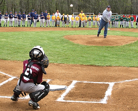 Saturday, May 2, was the opening day of the 2009 Little League season in both Owego and Nichols. The day started with parades in both Owego and Nichols, ending up at their home fields, Hyde Park (Owego) and Kirby Park (Nichols), followed by opening ceremonies. Above: The flag is raised by Dean Morgan, at Hyde Park in Owego. Below: In Nichols the first pitch was thrown by Scott Taylor - Superintend of Tioga Central Schools.